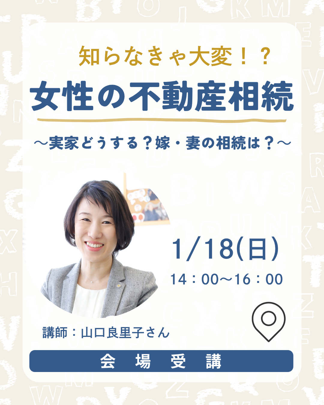 「実家を相続したけれど、空き家になったらどうすればいいの…?」「将来親や夫から家を相続するかもしれないけど、知識が無くて不安…」そんな女性がぜひ知っておきたい、不動産相続についての考え方の基本から、遺産の分割や売却、今からできる準備や困ったときの相談先などなど、数々の相続ケースに対応してきた女性の司法書士の講師がお伝えします!