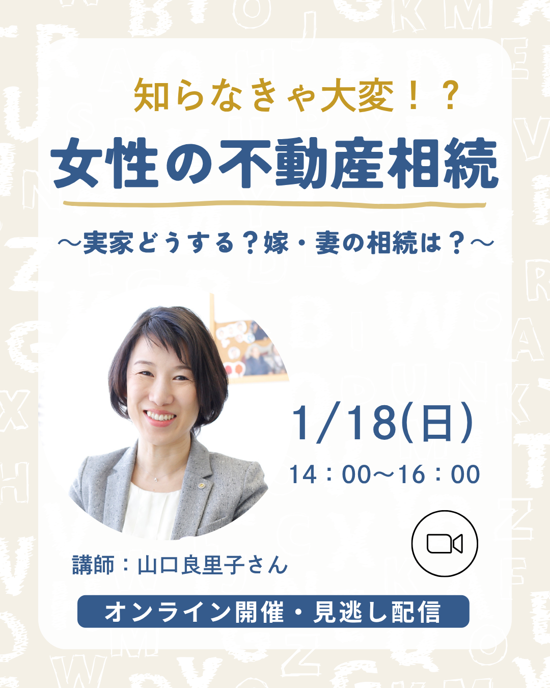 「実家を相続したけれど、空き家になったらどうすればいいの…?」「将来親や夫から家を相続するかもしれないけど、知識が無くて不安…」そんな女性がぜひ知っておきたい、不動産相続についての考え方の基本から、遺産の分割や売却、今からできる準備や困ったときの相談先などなど、数々の相続ケースに対応してきた女性の司法書士の講師がお伝えします!
