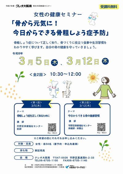 【男女共同参画セミナー】(第2回)女性の健康セミナー「骨から元気に!今日からできる骨粗しょう症予防」