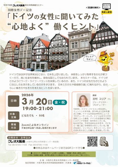【男女共同参画セミナー】★オンライン・見逃し配信★国際女性デー記念「ドイツの女性に聞いてみた”心地よく”働くヒント」