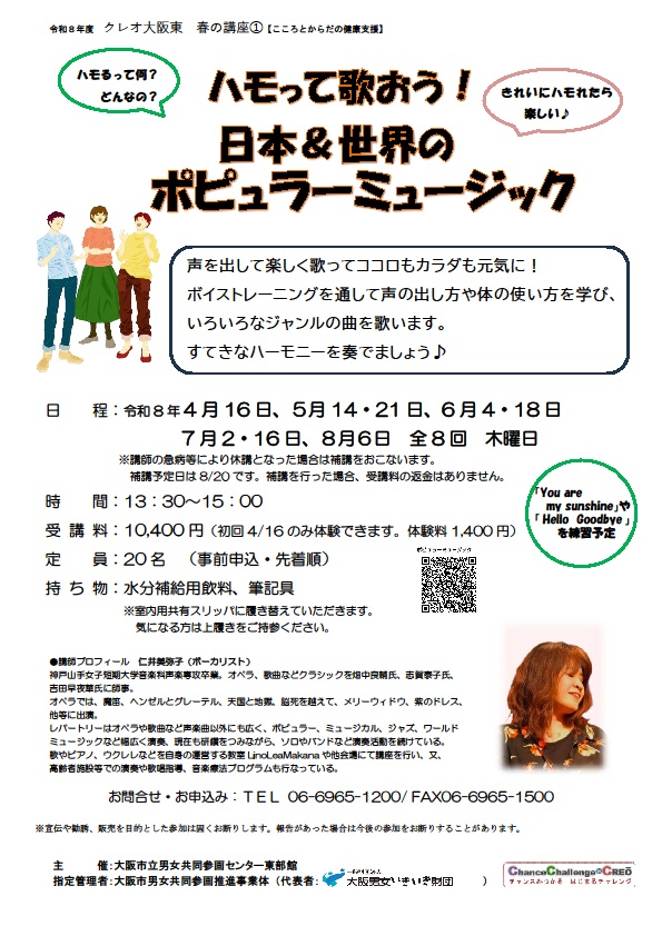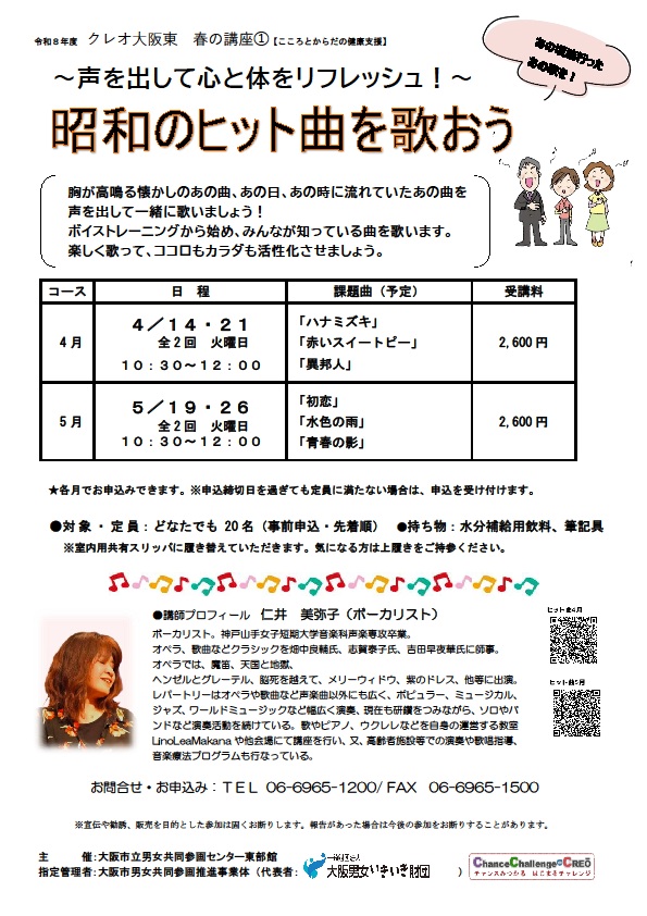 声を出して楽しく歌ってココロもカラダも元気に!いろいろなジャンルの名曲を練習します。どうしたら声を出しやすいか、こうしたら歌いやすいなど、ボイストレーニングと共に学び、すてきなハーモニーを奏でましょう♪ 講座初回日4/16のみ体験(体験料¥1,400)もおこなっております。 詳しくはお問い合わせください。 【持ち物】筆記用具、水分補給用の水、スリッパ(※共有スリッパあり)
