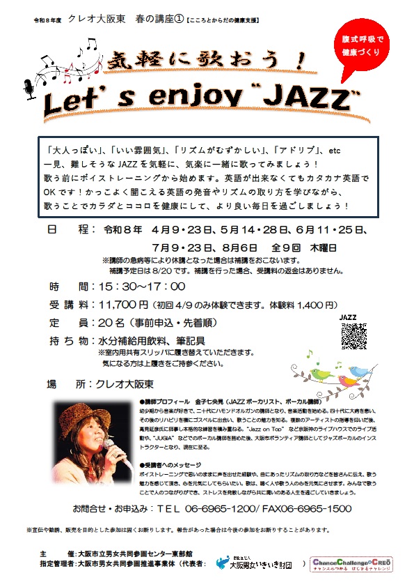 「大人っぽい」、「いい雰囲気」、「リズムが難しい」、「アドリブ」、etc…一見難しそうなJAZZを気軽に、気楽に一緒に歌ってみましょう!歌う前にボイストレーニングから始めます。英語ができなくてもカタカナ英語でOKです!かっこよく聞こえる英語の発音やリズムの取り方を学びながら、歌うことでカラダとココロを健康にして、よりよい毎日を過ごしましょう! 講座初回日4/9のみ体験(体験料¥1,400)もおこなっております。 詳しくはお問い合わせください。 【持ち物】筆記用具、水分補給用の水、スリッパ(※共有スリッパあり)