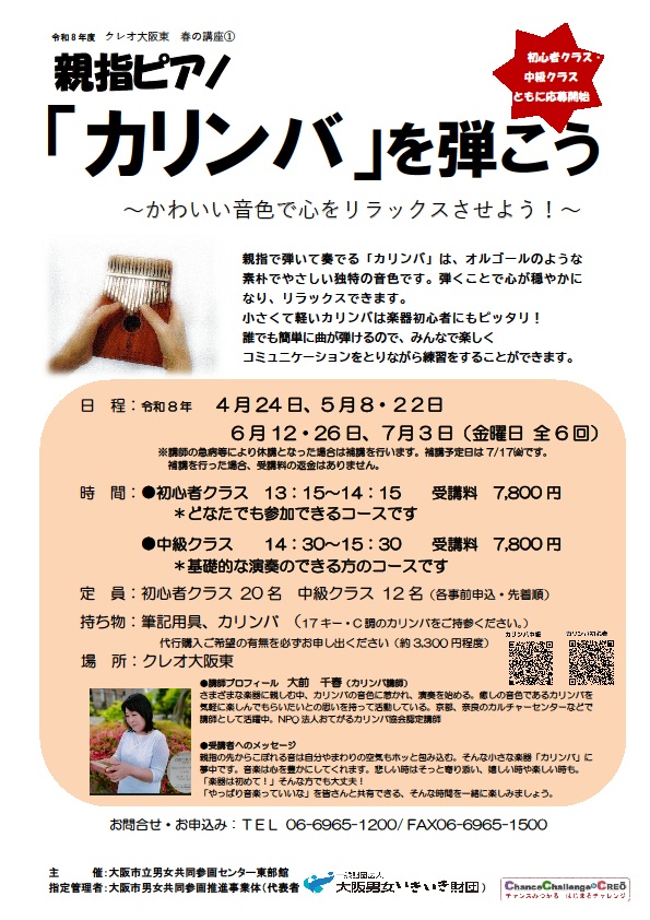 親指で弾いて奏でるアフリカの民族楽器「カリンバ」はオルゴールのような素朴でやさしい独特の音色です。弾くことで心が穏やかになり、リラックスできます。 誰でも簡単に弾けるのでみんなで楽しくコミュニケーションをとりながら練習することができます。 基礎的な演奏のできる方のコースです。 ※講座は事前申込先着順です。 【使用するカリンバ】17キー、C調のカリンバ