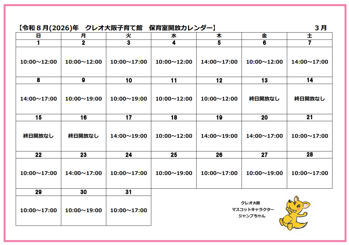 まだまだ風がきつかったり、花粉症などで、外へ子どもを連れてお散歩に行きづらかったりで、ついおうちにこもりがちになっていませんか? クレオ大阪南では、子どもと保護者を対象に、保育室を開放します。ちょっと気分転換に、保育室に親子で遊びに来ませんか? ※休館日および保育室の予約済み日は除く。 詳しくは窓口までお問合せください。 (令和8年3月21日(土)は臨時開館日です。)