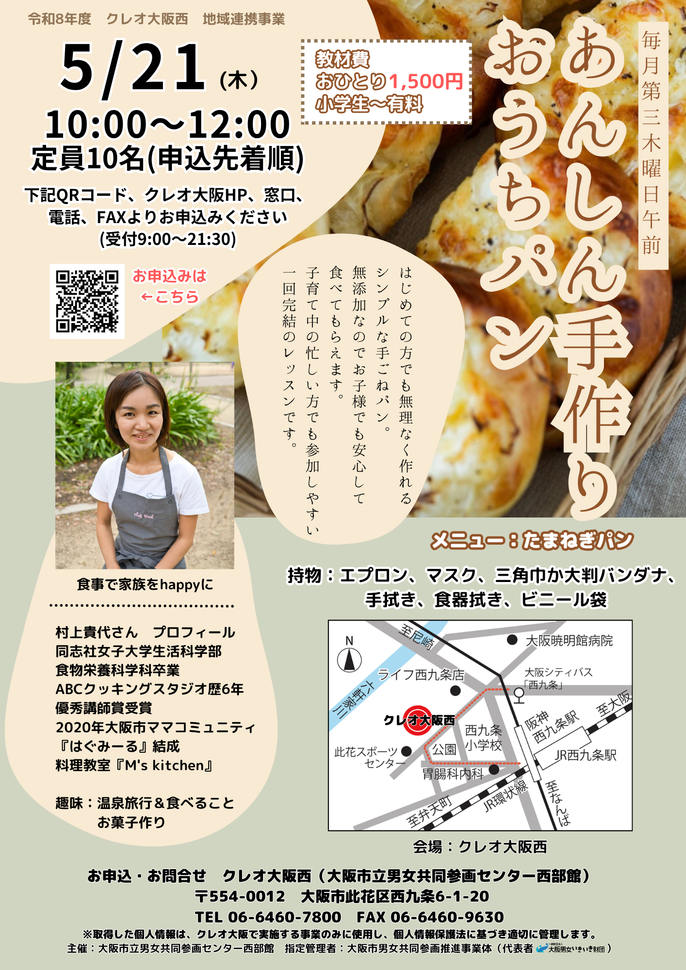 はじめての方でも無理なく作れるシンプルな手ごねパン。 無添加なのでお子様でも安心して食べてもらえます。 子育て中の忙しい方でも参加しやすい、一回完結のレッスンです。 ■5月はたまねぎパンを作ります■ ★もちもの エプロン、三角巾か大判バンダナ、マスク、手拭き、食器拭き、ビニール袋小(ぬれたフキン等を持ち帰るため)