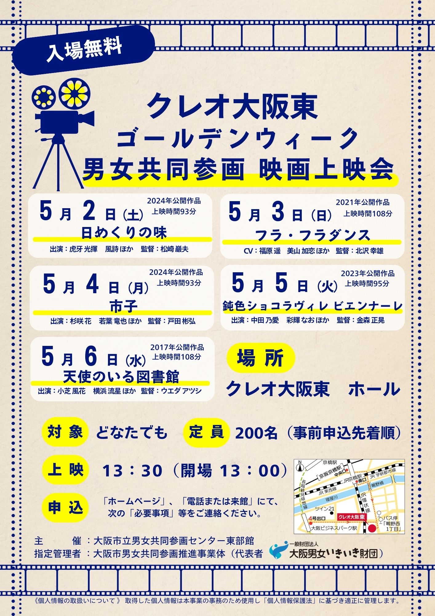 多様な生き方をテーマとした映画を日替わりで上映します。 男女共同参画をわかりやすく説明したショート動画も流します。 この機会に男女共同参画への理解も深めましょう。 ≪上映映画≫ ●5月2日(土)日めくりの味(上映時間93分) ●5月3日(日)フラ・フラダンス(上映時間108分) ●5月4日(月)市子(上映時間93分) ●5月5日(火)純色ショコラヴィレ ビエンナーレ(上映時間95分) ●5月6日(水)天使のいる図書館(上映時間108分) 備考欄にご希望の上映日をお知らせください。